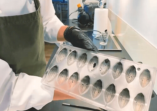 To recreate recipes and designs from the class you will need polycarbonate moulds, chocolate, sugars, and other ingredients needed for recipes.