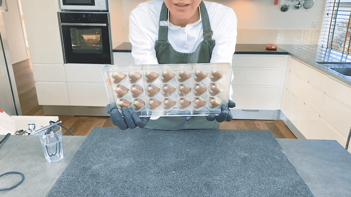 In this class, you will learn how to make moulded bonbons with Champagne & Strawberry double-layered filling and velvet finish