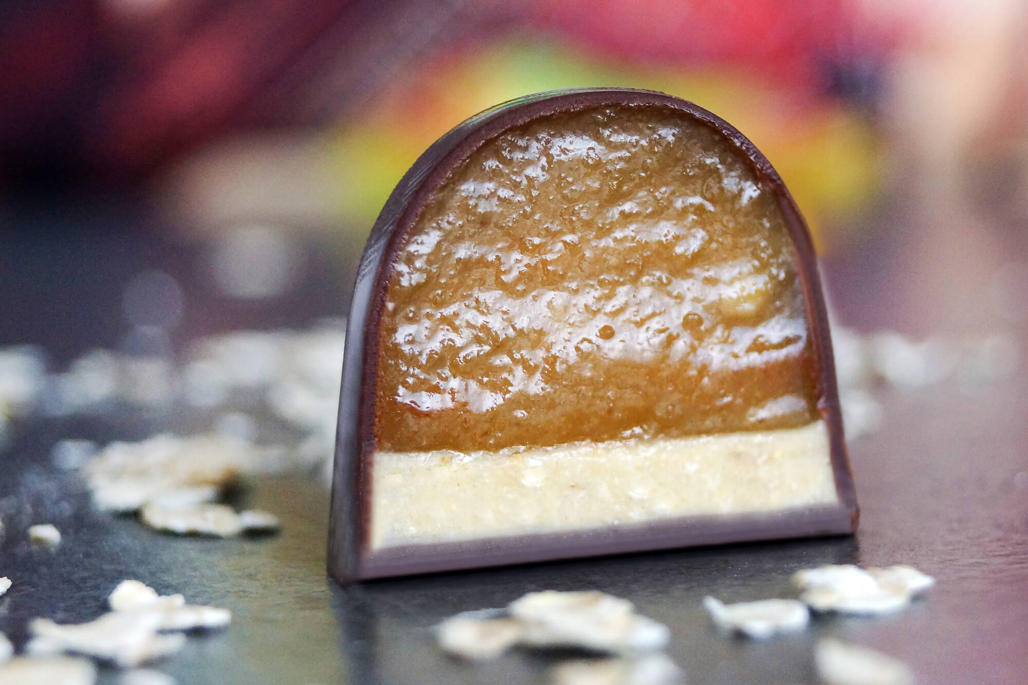 Pear & Tonka beans soft Caramel with Marple syrup, Crunchy layer with Oatmeal Cookie.