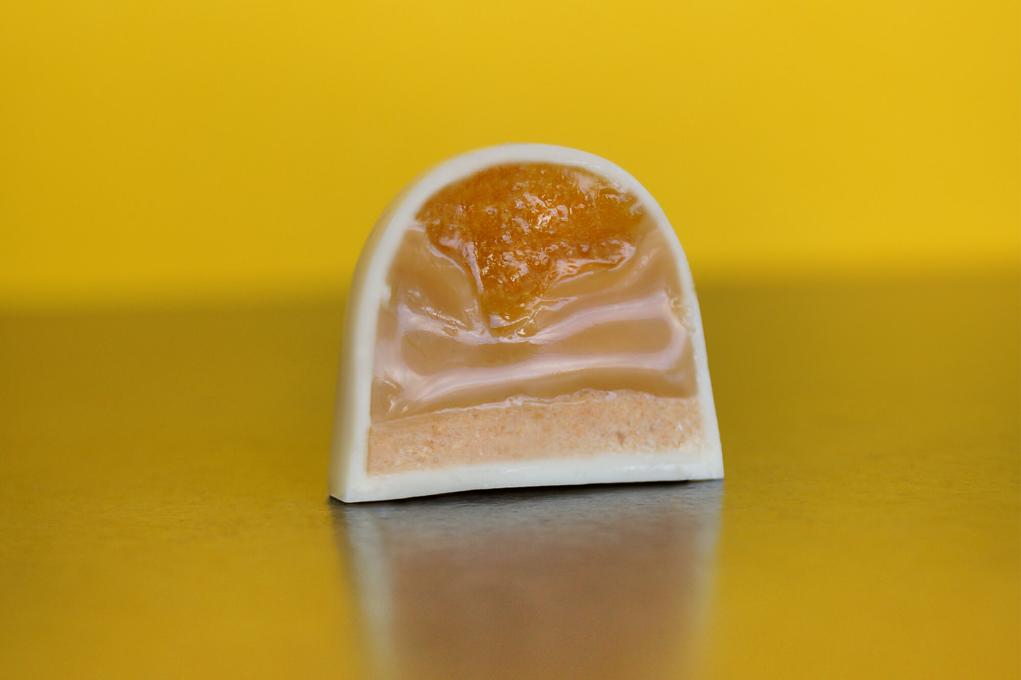 Orange, Lemon & Ginger Pate de Fruit with Honey, Caramelized Honey Ganache, Crunchy layer with Ginger Sable.