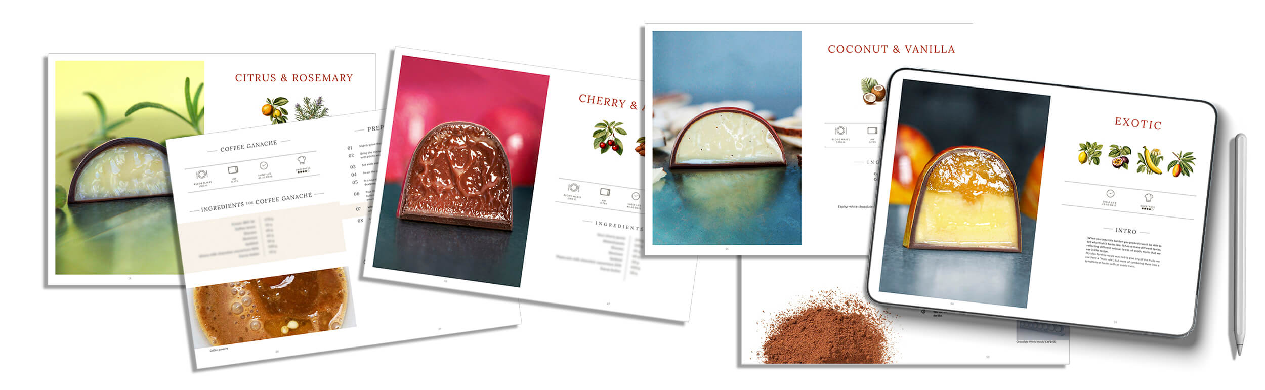 To recreate recipes from the book you will need – sugars ( Glucose, Dextrose, Inverted sugar, Sorbitol), fruit purees, chocolate (e.g. Valrhona or Cacao Barry), and other traditional ingredients and tools (f.ex. moulds) used in artisan chocolate making.