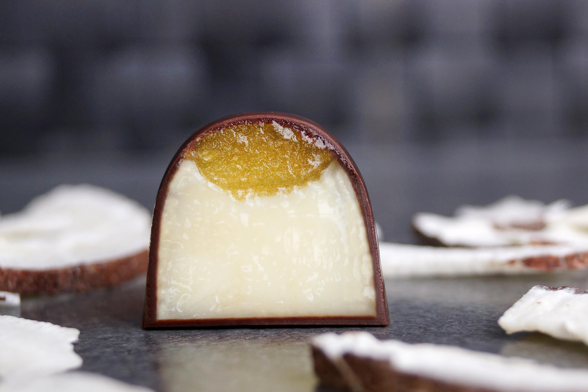 Passion fruit, Yuzu & Vanilla ganache with vegan milk Chocolate
